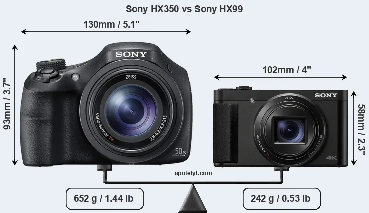The side-by-side display below illustrates the physical size and weight of the Sony HX350 and the Sony HX99. The two cameras are presented according to their relative size. Three consecutive perspectives from the front, the top, and the back are available. All size dimensions are rounded to the nearest millimeter.