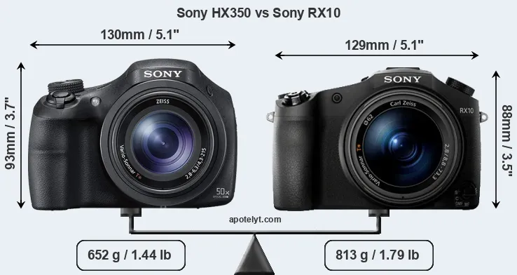If the front view area (width x height) of the cameras is taken as an aggregate measure of their size, the Sony RX10 is notably smaller (6 percent) than the Sony HX350. However, the RX10 is markedly heavier (25 percent) than the HX350. It is noteworthy in this context that the RX10 is splash and dust-proof, while the HX350 does not feature any corresponding weather-sealing.