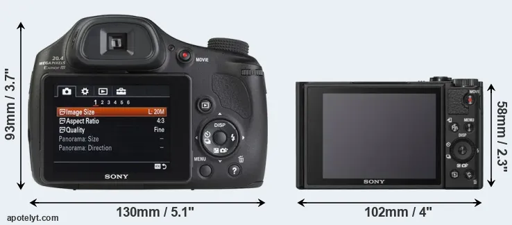 The side-by-side display below illustrates the physical size and weight of the Sony HX350 and the Sony WX800. The two cameras are presented according to their relative size. Three consecutive perspectives from the front, the top, and the back are available. All size dimensions are rounded to the nearest millimeter.