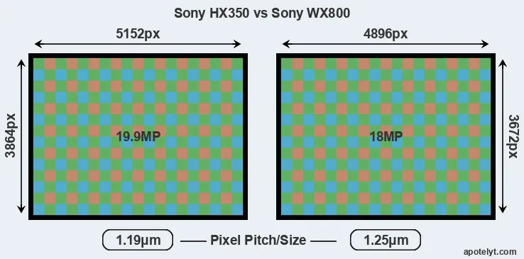 While the two cameras under review share the same sensor size, the HX350 offers a higher resolution of 19.9 megapixels, compared with 18 MP of the WX800. This megapixels advantage translates into a 5 percent gain in linear resolution. On the other hand, these sensor specs imply that the HX350 has a higher pixel density and a smaller size of the individual pixel (with a pixel pitch of 1.19μm versus 1.25μm for the WX800). Moreover, it should be noted that the WX800 is a somewhat more recent model (by 1 year and 9 months) than the HX350, and its sensor might have benefitted from technological advances during this time that further enhance the light gathering capacity of individual pixels. Coming back to sensor resolution, it should be mentioned that neither of the two cameras has an anti-alias filter installed, so they are able to capture all the detail the sensor resolves.