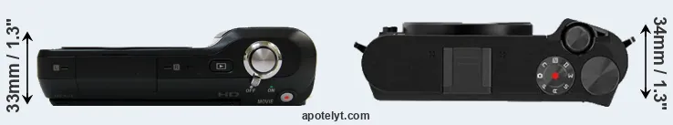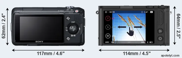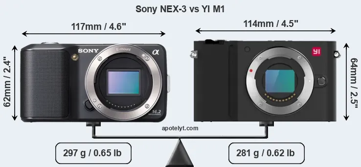 The side-by-side display below illustrates the physical size and weight of the Sony NEX-3 and the YI M1. The two cameras are presented according to their relative size. Three consecutive perspectives from the front, the top, and the back are available. All width, height and depth dimensions are rounded to the nearest millimeter.