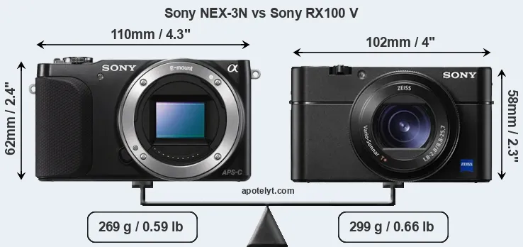 The side-by-side display below illustrates the physical size and weight of the Sony NEX-3N and the Sony RX100 V. The two cameras are presented according to their relative size. Three consecutive perspectives from the front, the top, and the back are available. All width, height and depth measures are rounded to the nearest millimeter.