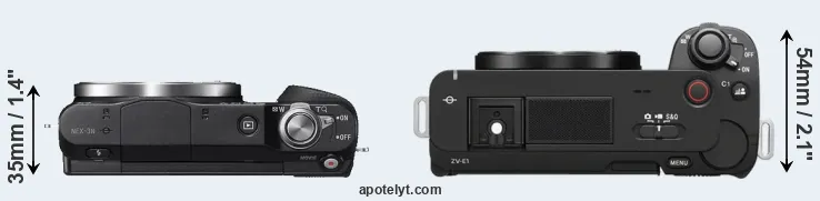 An illustration of the physical size and weight of the Sony NEX-3N and the Sony ZV-E1 is provided in the side-by-side display below. The two cameras are presented according to their relative size. Three consecutive perspectives from the front, the top, and the back are available. All size dimensions are rounded to the nearest millimeter.