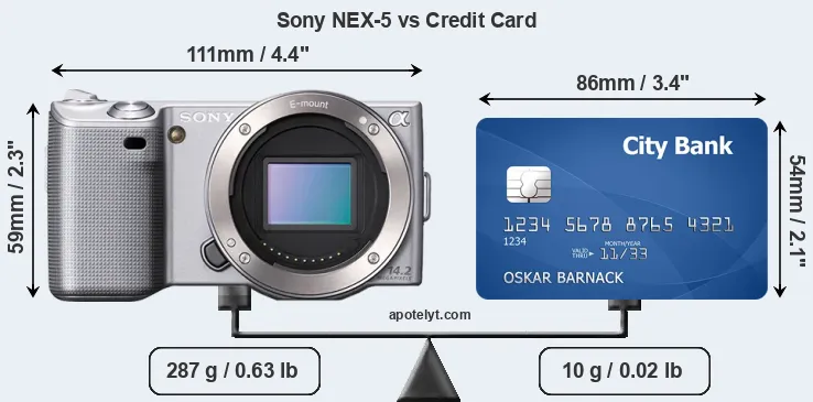 The physical dimensions of the Sony NEX-5 relative to a credit card are illustrated in the side-by-side display below. Three consecutive perspectives from the front, the top, and the back are presented. All width, height and depth dimensions are rounded to the nearest millimeter.
