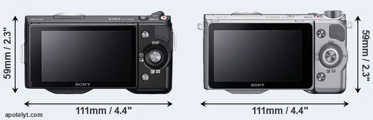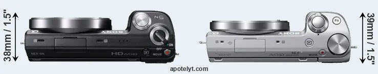 The side-by-side display below illustrates the physical size and weight of the Sony NEX-5N and the Sony NEX-5T. The two cameras are presented according to their relative size. Three consecutive views from the front, the top, and the rear side are shown. All width, height and depth dimensions are rounded to the nearest millimeter.