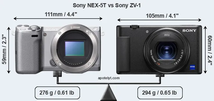 The physical size and weight of the Sony NEX-5T and the Sony ZV-1 are illustrated in the side-by-side display below. The two cameras are presented according to their relative size. Three successive views from the front, the top, and the rear are shown. All width, height and depth measures are rounded to the nearest millimeter.