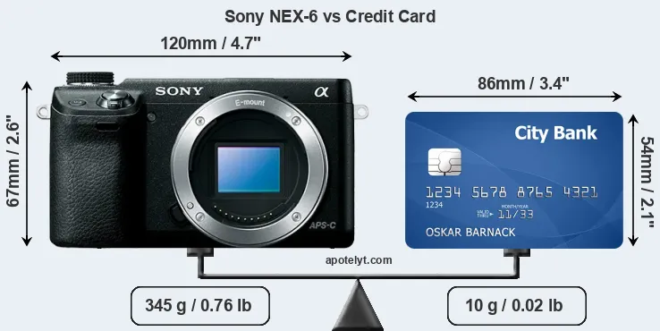 An illustration of the physical dimensions of the Sony NEX-6 vis-à-vis a credit card is provided in the side-by-side display below. Three successive views from the front, the top, and the rear are shown. All width, height and depth dimensions are rounded to the nearest millimeter.