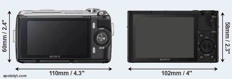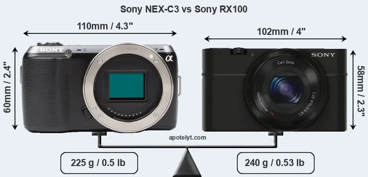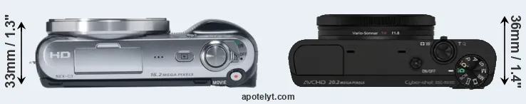An illustration of the physical size and weight of the Sony NEX-C3 and the Sony RX100 is provided in the side-by-side display below. The two cameras are presented according to their relative size. Three consecutive perspectives from the front, the top, and the back are available. All width, height and depth measures are rounded to the nearest millimeter.