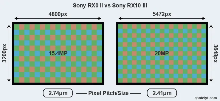 While the two cameras under review share the same sensor size, the RX10 III offers a higher resolution of 20 megapixels, compared with 15.4 MP of the RX0 II. This megapixels advantage translates into a 14 percent gain in linear resolution. On the other hand, these sensor specs imply that the RX10 III has a higher pixel density and a smaller size of the individual pixel (with a pixel pitch of 2.41μm versus 2.74μm for the RX0 II). Moreover, it should be noted, that the RX0 II is much more recent (by 2 years and 11 months) than the RX10 III, and its sensor will have benefitted from technological advances during this time that further enhance the light gathering capacity of individual pixels.