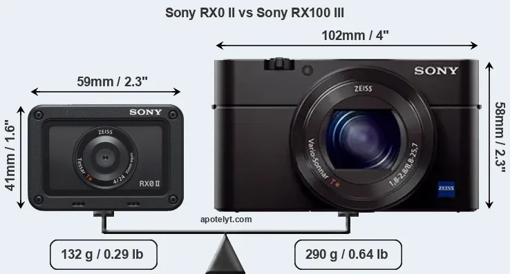 If the front view area (width x height) of the cameras is taken as an aggregate measure of their size, the Sony RX100 III is considerably larger (145 percent) than the Sony RX0 II. Moreover, the RX100 III is substantially heavier (120 percent) than the RX0 II. It is worth mentioning in this context that the RX0 II is splash and dust resistant, while the RX100 III does not feature any corresponding weather-sealing. More than that, the RX0 II is water-proof up to 10m and can, thus, be used for underwater photography.
