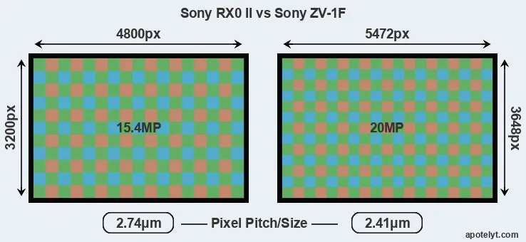 While the two cameras under review share the same sensor size, the ZV-1F offers a higher resolution of 20 megapixels, compared with 15.4 MP of the RX0 II. This megapixels advantage translates into a 14 percent gain in linear resolution. On the other hand, these sensor specs imply that the ZV-1F has a higher pixel density and a smaller size of the individual pixel (with a pixel pitch of 2.41μm versus 2.74μm for the RX0 II). However, it should be noted that the ZV-1F is much more recent (by 3 years and 6 months) than the RX0 II, and its sensor will have benefitted from technological advances during this time that compensate for the smaller pixel size.