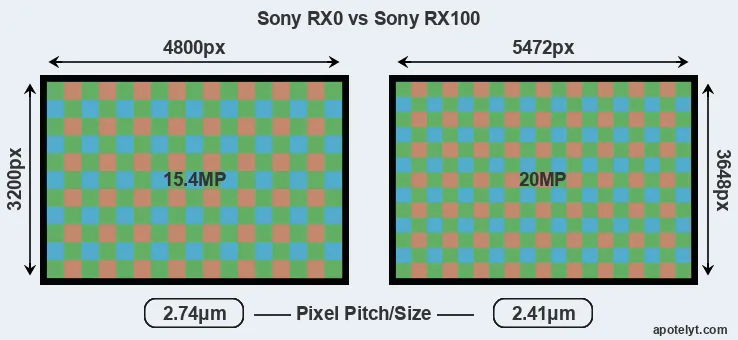 While the two cameras under review share the same sensor size, the RX100 offers a higher resolution of 20 megapixels, compared with 15.4 MP of the RX0. This megapixels advantage translates into a 14 percent gain in linear resolution. On the other hand, these sensor specs imply that the RX100 has a higher pixel density and a smaller size of the individual pixel (with a pixel pitch of 2.41μm versus 2.74μm for the RX0). Moreover, it should be noted, that the RX0 is much more recent (by 5 years and 2 months) than the RX100, and its sensor will have benefitted from technological advances during this time that further enhance the light gathering capacity of individual pixels.