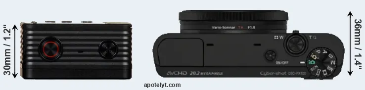 An illustration of the physical size and weight of the Sony RX0 and the Sony RX100 is provided in the side-by-side display below. The two cameras are presented according to their relative size. Three consecutive perspectives from the front, the top, and the back are available. All size dimensions are rounded to the nearest millimeter.