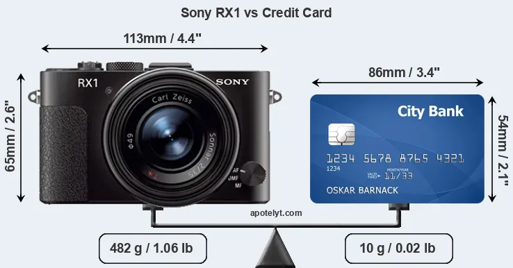 An illustration of the physical dimensions of the Sony RX1 vis-à-vis a credit card is provided in the side-by-side display below. Three consecutive views from the front, the top, and the rear side are shown. All width, height and depth measures are rounded to the nearest millimeter.
