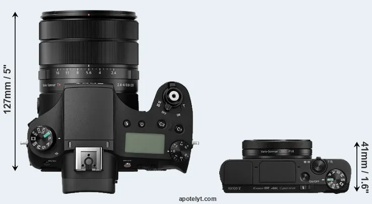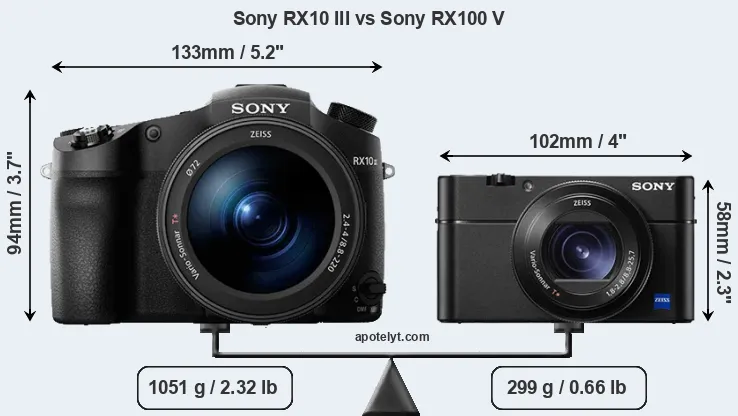 The physical size and weight of the Sony RX10 III and the Sony RX100 V are illustrated in the side-by-side display below. The two cameras are presented according to their relative size. Three consecutive perspectives from the front, the top, and the back are available. All width, height and depth dimensions are rounded to the nearest millimeter.