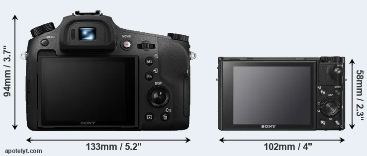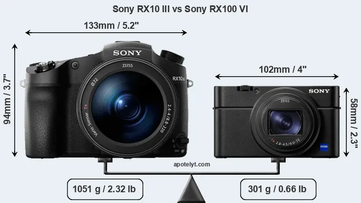 The physical size and weight of the Sony RX10 III and the Sony RX100 VI are illustrated in the side-by-side display below. The two cameras are presented according to their relative size. Three consecutive perspectives from the front, the top, and the back are available. All width, height and depth dimensions are rounded to the nearest millimeter.