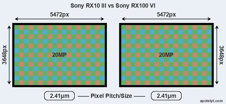 The two cameras under review do not only share the same sensor size, but also offer an identical resolution of 20 megapixels. This similarity in sensor specs implies that both the RX10 III and the RX100 VI have the same pixel density, as well as the same pixel size. It should, however, be noted that the RX100 VI is much more recent (by 2 years and 2 months) than the RX10 III, and its sensor will have benefitted from technological advances during this time.