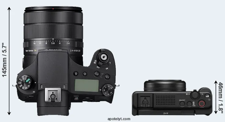 An illustration of the physical size and weight of the Sony RX10 IV and the Sony ZV-1F is provided in the side-by-side display below. The two cameras are presented according to their relative size. Three consecutive views from the front, the top, and the rear side are shown. All size dimensions are rounded to the nearest millimeter.