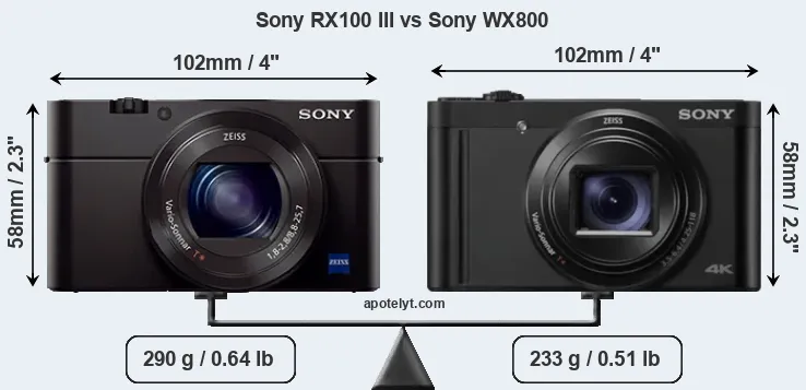 An illustration of the physical size and weight of the Sony RX100 III and the Sony WX800 is provided in the side-by-side display below. The two cameras are presented according to their relative size. Three consecutive views from the front, the top, and the rear side are shown. All width, height and depth dimensions are rounded to the nearest millimeter.