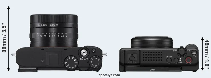 The side-by-side display below illustrates the physical size and weight of the Sony RX1R III and the Sony ZV-1F. The two cameras are presented according to their relative size. Three consecutive perspectives from the front, the top, and the back are available. All width, height and depth dimensions are rounded to the nearest millimeter.