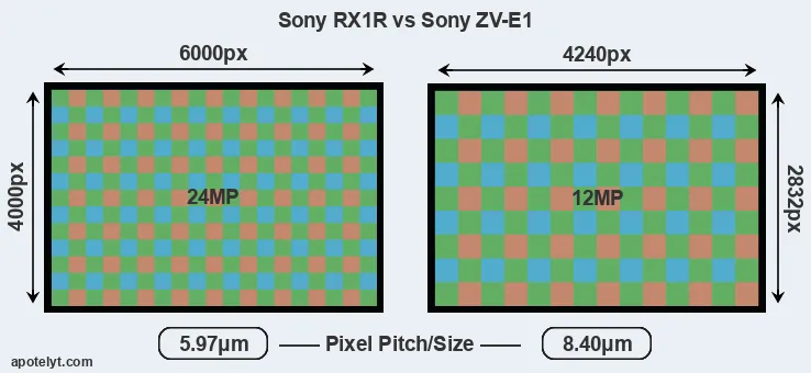 With 24MP, the RX1R offers a higher resolution than the ZV-E1 (12MP), but the RX1R has smaller individual pixels (pixel pitch of 5.97μm versus 8.40μm for the ZV-E1). Moreover, the ZV-E1 is a much more recent model (by 9 years and 9 months) than the RX1R, and its sensor will have benefitted from technological advances during this time that enhance the light gathering capacity of its pixels. Coming back to sensor resolution, it should be mentioned that the RX1R has no anti-alias filter installed, so that it can capture all the detail its sensor resolves.