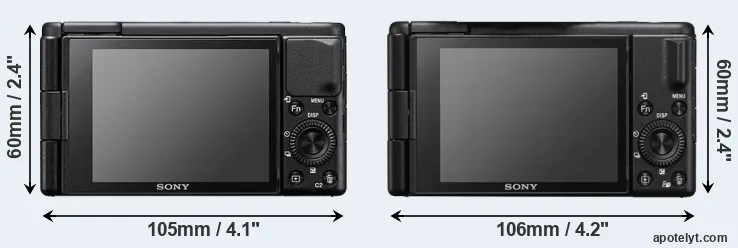 The side-by-side display below illustrates the physical size and weight of the Sony ZV-1 and the Sony ZV-1 II. The two cameras are presented according to their relative size. Three consecutive perspectives from the front, the top, and the back are available. All size dimensions are rounded to the nearest millimeter.