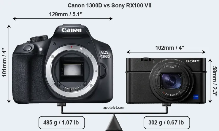 Die Canon EOS 1300D und die Sony Cyber-shot DSC-RX100 VII sind zwei digitale Kameras, die im März 2016 beziehungsweise im Juli 2019 vorgestellt wurden. Die 1300D is eine eine digitale Spiegelreflexkamera, während es sich bei der RX100 VII um eine Kompaktkamera mit integriertem Objektiv handelt. Die Kameras sind mit einem APS-C Sensor (1300D) und einem 1 Zoll Sensor (RX100 VII) ausgerüstet. Die Canon hat eine Auflösung von 17,9 Megapixel, während die Sony 20,0 MP bietet.
