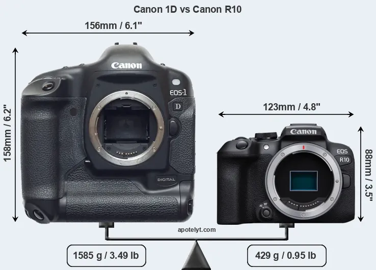 Die physische Größe und das Gewicht der Canon 1D und der Canon R10 werden in der nachfolgenden Graphik illustriert. Die beiden Kameras werden entsprechend ihrer relativen Größe dargestellt. Alle Größenangaben sind auf den nächsten Millimeter gerundet.
