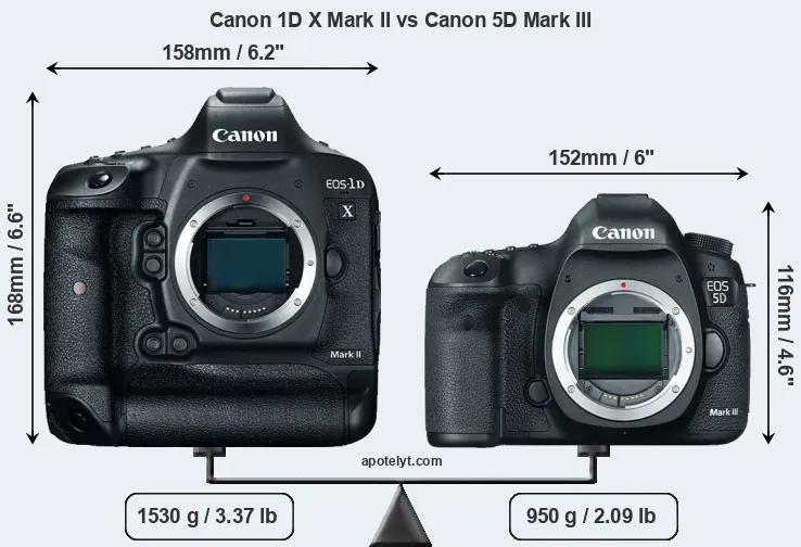 Die physische Größe und das Gewicht der Canon 1D X Mark II und der Canon 5D Mark III werden in der nachfolgenden Graphik illustriert. Die beiden Kameras werden entsprechend ihrer relativen Größe dargestellt. Alle Größenangaben sind auf den nächsten Millimeter gerundet.