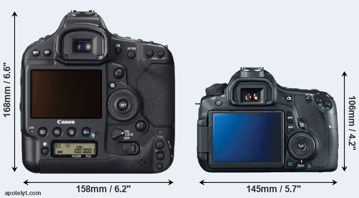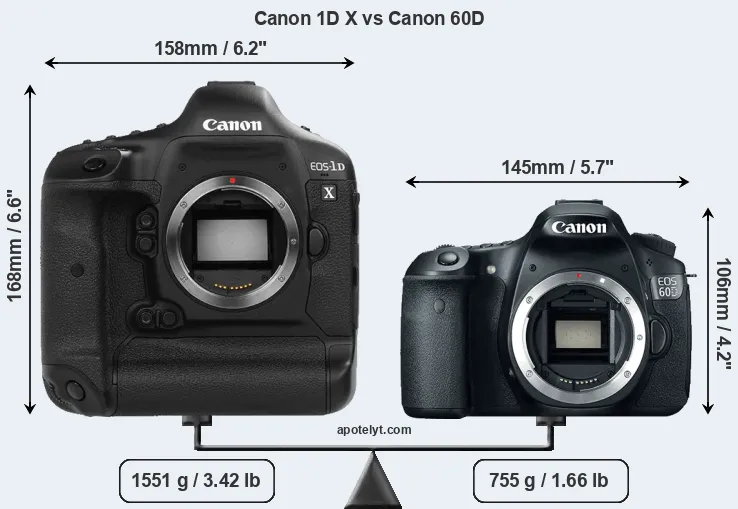 Die physische Größe und das Gewicht der Canon 1D X und der Canon 60D werden in der nachfolgenden Graphik illustriert. Die beiden Kameras werden entsprechend ihrer relativen Größe dargestellt. Alle Größenangaben sind auf den nächsten Millimeter gerundet.