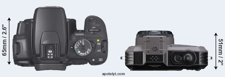 Die physische Größe und das Gewicht der Canon 400D und der Pentax WG-1000 werden in der nachfolgenden Graphik illustriert. Die beiden Kameras werden entsprechend ihrer relativen Größe dargestellt. Alle Größenangaben sind auf den nächsten Millimeter gerundet.