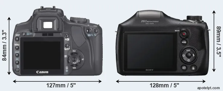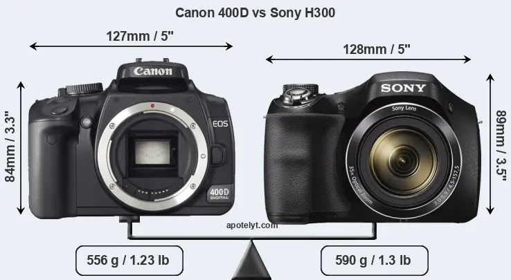Die physische Größe und das Gewicht der Canon 400D und der Sony H300 werden in der nachfolgenden Graphik illustriert. Die beiden Kameras werden entsprechend ihrer relativen Größe dargestellt. Alle Größenangaben sind auf den nächsten Millimeter gerundet.