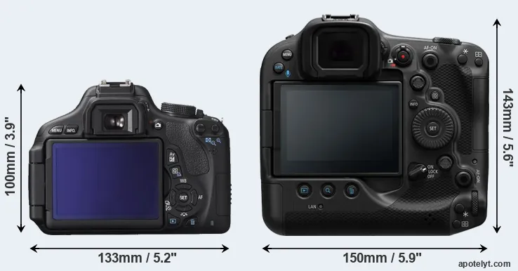Die physische Größe und das Gewicht der Canon 600D und der Canon R3 werden in der nachfolgenden Graphik illustriert. Die beiden Kameras werden entsprechend ihrer relativen Größe dargestellt. Alle Größenangaben sind auf den nächsten Millimeter gerundet.