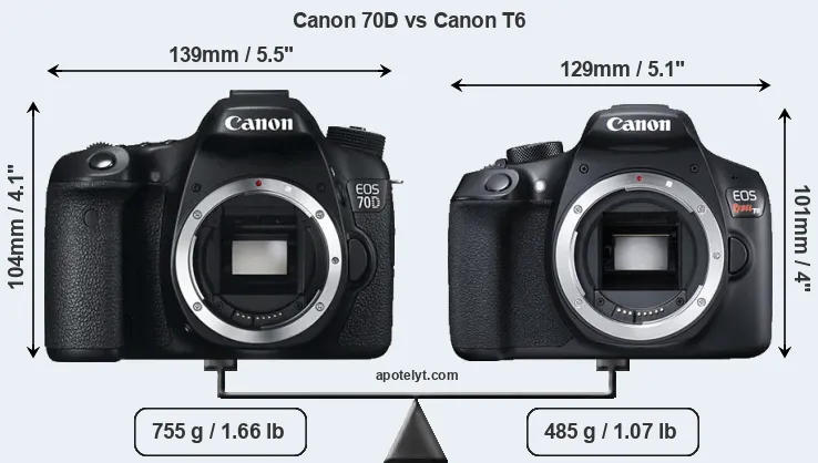 Die physische Größe und das Gewicht der Canon 70D und der Canon T6 werden in der nachfolgenden Graphik illustriert. Die beiden Kameras werden entsprechend ihrer relativen Größe dargestellt. Alle Größenangaben sind auf den nächsten Millimeter gerundet.