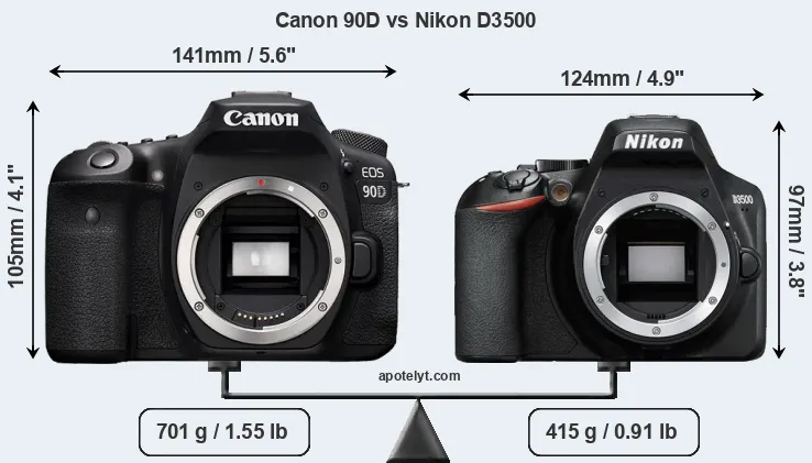 Die physische Größe und das Gewicht der Canon 90D und der Nikon D3500 werden in der nachfolgenden Graphik illustriert. Die beiden Kameras werden entsprechend ihrer relativen Größe dargestellt. Alle Größenangaben sind auf den nächsten Millimeter gerundet.