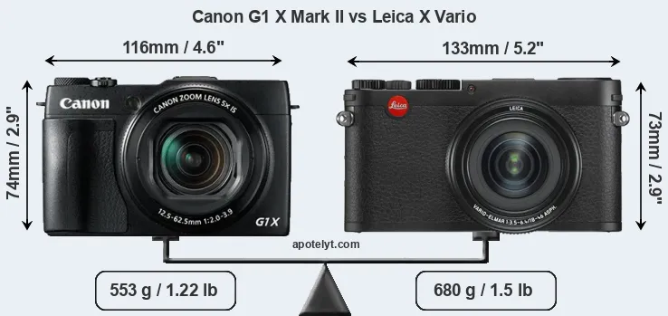 Die Canon PowerShot G1 X Mark II und die Leica X Vario (Typ 107) sind zwei digitale Kameras, die im Februar 2014 beziehungsweise im Juni 2013 vorgestellt wurden. Sowohl die G1X Mark II als auch die X Vario sind Kompaktkameras mit integriertem Objektiv, die mit einem 1,5 Zoll Sensor (G1X Mark II) und einem APS-C Sensor (X Vario) ausgerüstet sind. Die Canon hat eine Auflösung von 13,0 Megapixel, während die Leica 16,1 MP bietet.