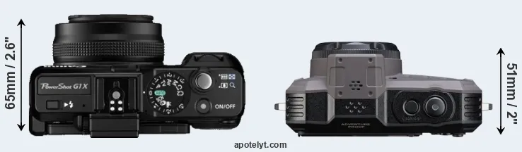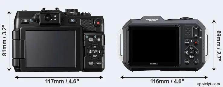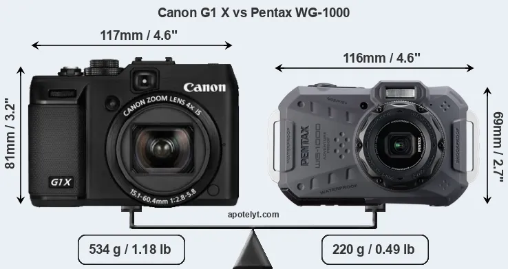 Die physische Größe und das Gewicht der Canon G1 X und der Pentax WG-1000 werden in der nachfolgenden Graphik illustriert. Die beiden Kameras werden entsprechend ihrer relativen Größe dargestellt. Alle Größenangaben sind auf den nächsten Millimeter gerundet.