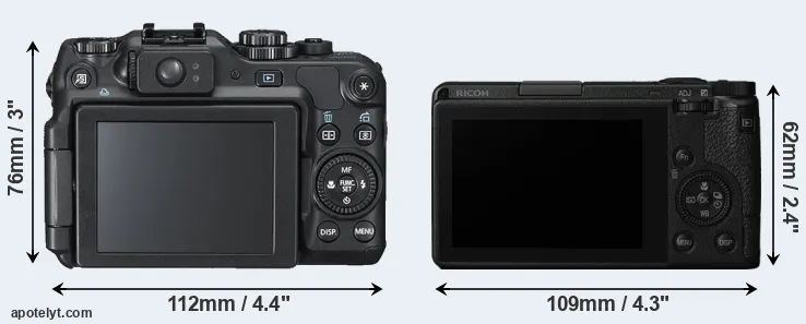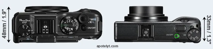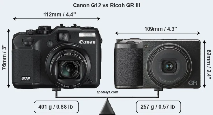 Die physische Größe und das Gewicht der Canon G12 und der Ricoh GR III werden in der nachfolgenden Graphik illustriert. Die beiden Kameras werden entsprechend ihrer relativen Größe dargestellt. Alle Größenangaben sind auf den nächsten Millimeter gerundet.