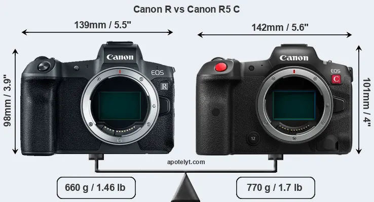 Die physische Größe und das Gewicht der Canon R und der Canon R5 C werden in der nachfolgenden Graphik illustriert. Die beiden Kameras werden entsprechend ihrer relativen Größe dargestellt. Alle Größenangaben sind auf den nächsten Millimeter gerundet.