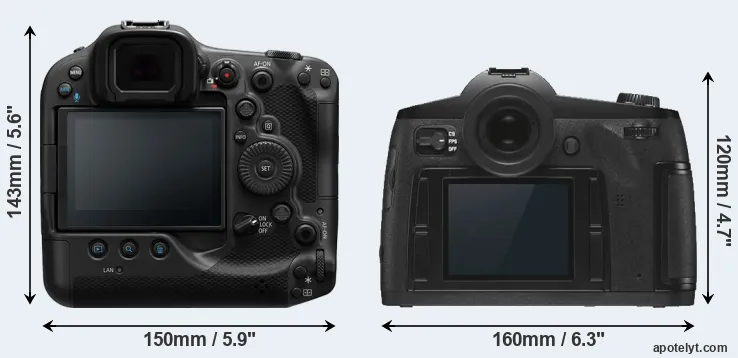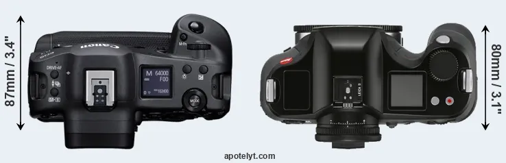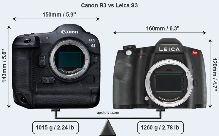 Die physische Größe und das Gewicht der Canon R3 und der Leica S3 werden in der nachfolgenden Graphik illustriert. Die beiden Kameras werden entsprechend ihrer relativen Größe dargestellt. Alle Größenangaben sind auf den nächsten Millimeter gerundet.