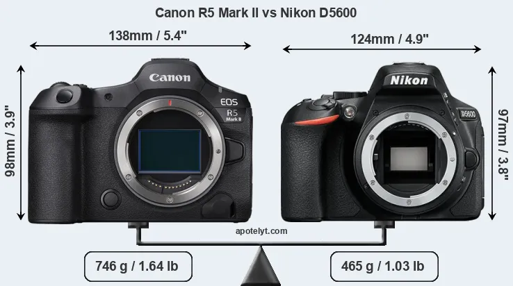 Die physische Größe und das Gewicht der Canon R5 Mark II und der Nikon D5600 werden in der nachfolgenden Graphik illustriert. Die beiden Kameras werden entsprechend ihrer relativen Größe dargestellt. Alle Größenangaben sind auf den nächsten Millimeter gerundet.