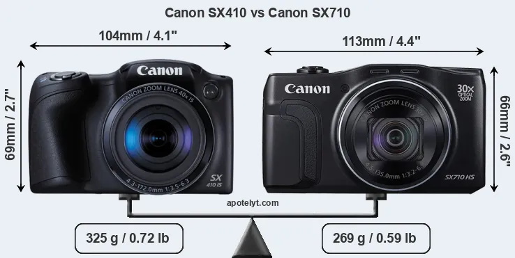 Die physische Größe und das Gewicht der Canon SX410 und der Canon SX710 werden in der nachfolgenden Graphik illustriert. Die beiden Kameras werden entsprechend ihrer relativen Größe dargestellt. Alle Größenangaben sind auf den nächsten Millimeter gerundet.