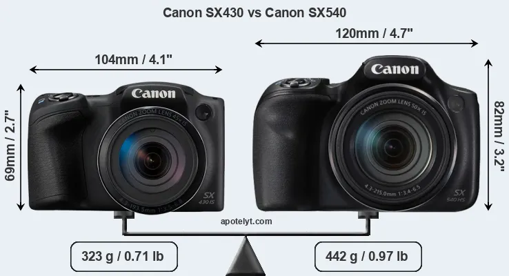 Die physische Größe und das Gewicht der Canon SX430 und der Canon SX540 werden in der nachfolgenden Graphik illustriert. Die beiden Kameras werden entsprechend ihrer relativen Größe dargestellt. Alle Größenangaben sind auf den nächsten Millimeter gerundet.