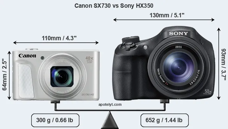 Die physische Größe und das Gewicht der Canon SX730 und der Sony HX350 werden in der nachfolgenden Graphik illustriert. Die beiden Kameras werden entsprechend ihrer relativen Größe dargestellt. Alle Größenangaben sind auf den nächsten Millimeter gerundet.