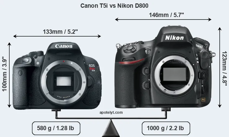 Die physische Größe und das Gewicht der Canon T5i und der Nikon D800 werden in der nachfolgenden Graphik illustriert. Die beiden Kameras werden entsprechend ihrer relativen Größe dargestellt. Alle Größenangaben sind auf den nächsten Millimeter gerundet.
