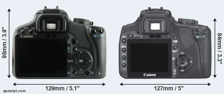 Die physische Größe und das Gewicht der Canon XSi und der Canon XTi werden in der nachfolgenden Graphik illustriert. Die beiden Kameras werden entsprechend ihrer relativen Größe dargestellt. Alle Größenangaben sind auf den nächsten Millimeter gerundet.