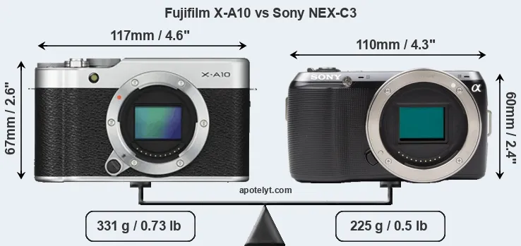 Die physische Größe und das Gewicht der Fujifilm X-A10 und der Sony NEX-C3 werden in der nachfolgenden Graphik illustriert. Die beiden Kameras werden entsprechend ihrer relativen Größe dargestellt. Alle Größenangaben sind auf den nächsten Millimeter gerundet.