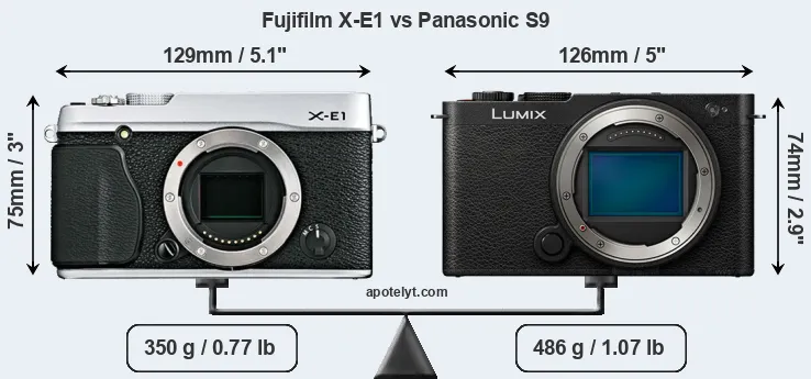 Die physische Größe und das Gewicht der Fujifilm X-E1 und der Panasonic S9 werden in der nachfolgenden Graphik illustriert. Die beiden Kameras werden entsprechend ihrer relativen Größe dargestellt. Alle Größenangaben sind auf den nächsten Millimeter gerundet.