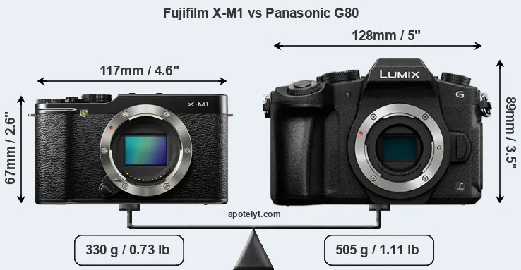 Die physische Größe und das Gewicht der Fujifilm X-M1 und der Panasonic G80 werden in der nachfolgenden Graphik illustriert. Die beiden Kameras werden entsprechend ihrer relativen Größe dargestellt. Alle Größenangaben sind auf den nächsten Millimeter gerundet.