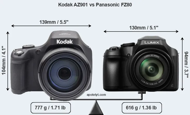 Die physische Größe und das Gewicht der Kodak AZ901 und der Panasonic FZ80 werden in der nachfolgenden Graphik illustriert. Die beiden Kameras werden entsprechend ihrer relativen Größe dargestellt. Alle Größenangaben sind auf den nächsten Millimeter gerundet.